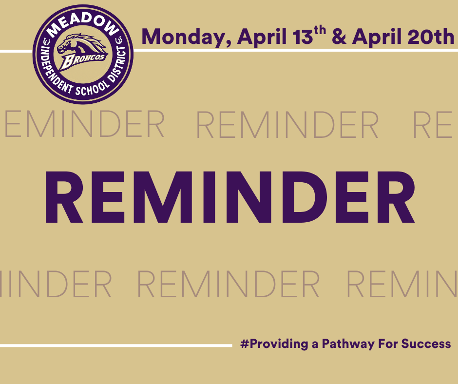 Friendly reminder that we will have school on Monday, April 13th and April 20th. These will be two full 5-day instructional weeks.